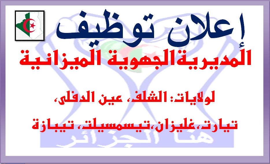 تتjعلن مصالح المديرية الجهوية للميزانية بالشلف عن تنظيم مسابقة للتوظيف على مستوى عدة ولايات كما يلي: الشلف، عين الدفلى، تيارت غليزان،تيسمسيلت، تيبازة .