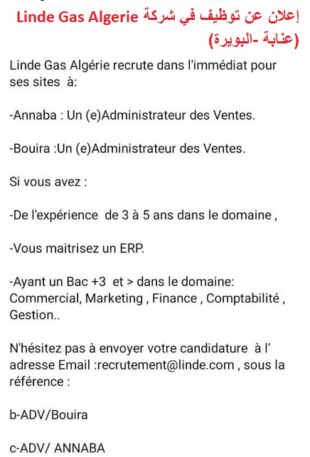 - إعلان عن توظيف في شركة Linde Gas Algerie (عنابة -البويرة)