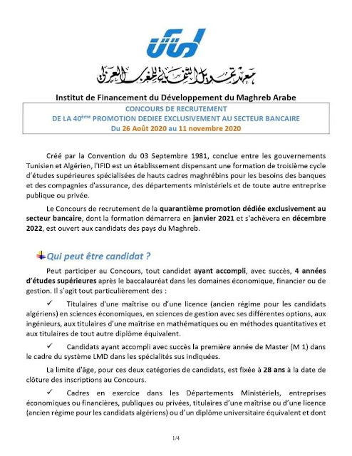 مسابقة التوظيف للدورة الأربعين مخصصة حصريا للقطاع المصرفي مفتوحة بشكل خاص للمترشحين التونسيين والجزائريين الحاصلين على الشهادات الجامعية المطلوبة.