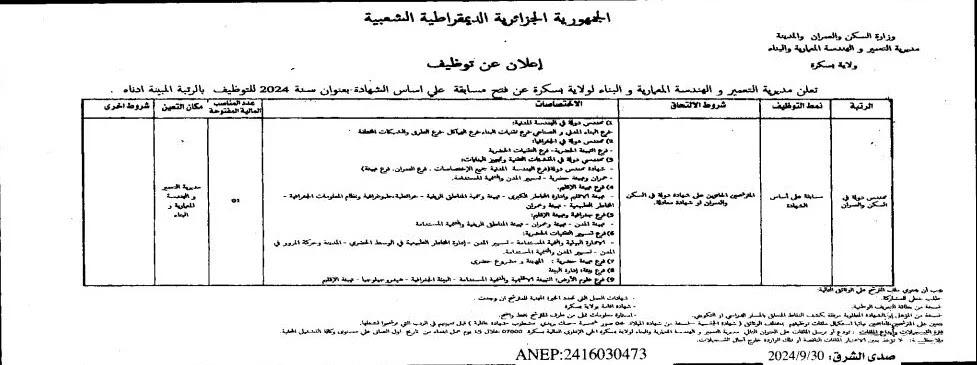 تعلن مديرية التعمير والهندسة المعمارية والبناء لولاية بسكرة عن فتح مسابقة على أساس الشهادة للالتحاق بالرتب التالية
